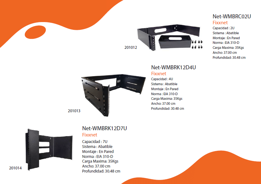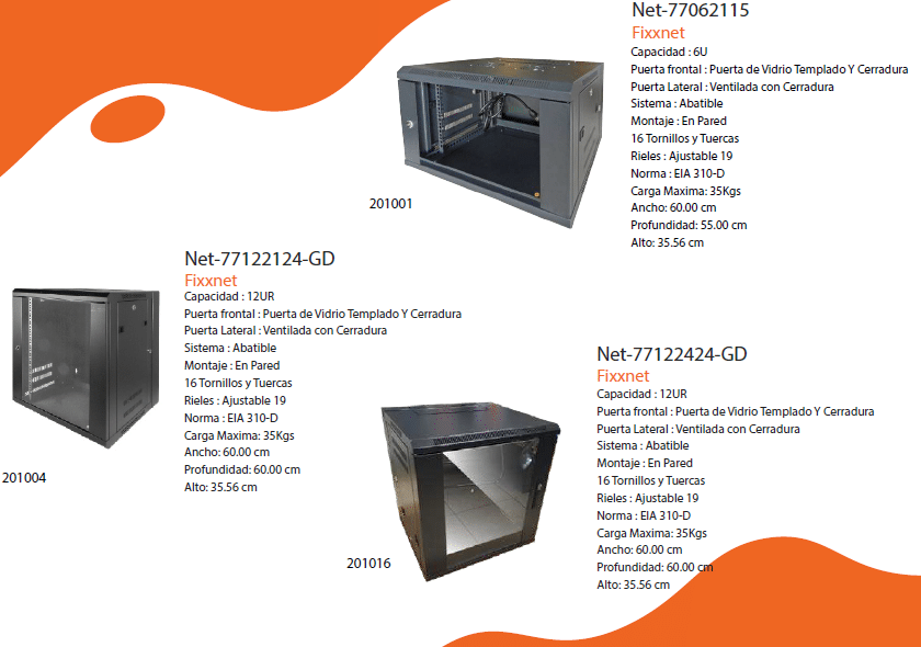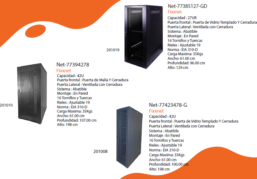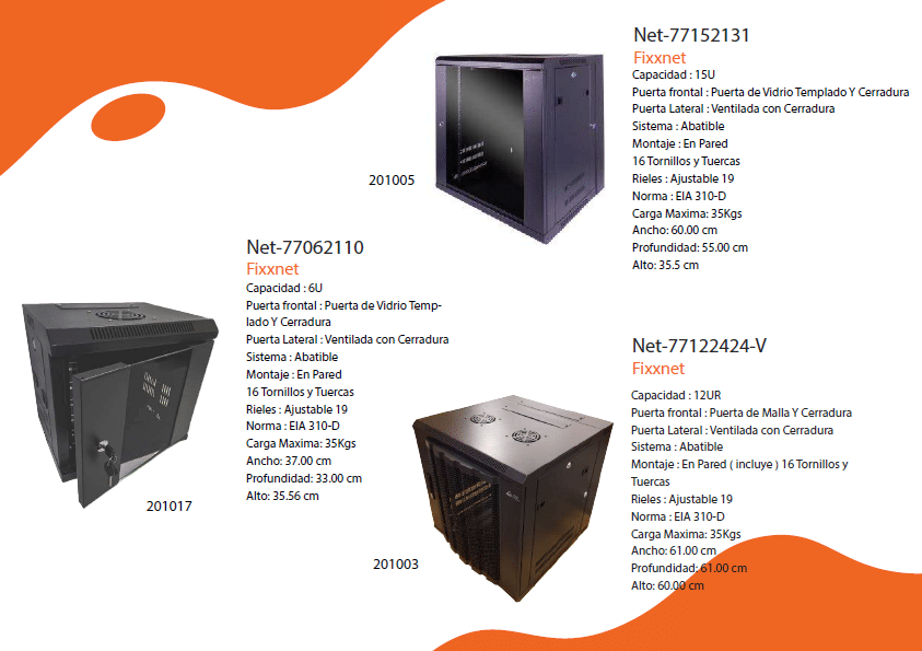 Fixxnet es un fabricante de soluciones de conectividad y su portafolio cuenta con gabinetes abatibles con ruedas de 42U, 42 UR y 27UR, gabinetes de pared con montaje de doble sección y soportes de pared de 7U, 4U, 3U, 2U y 1U con bisagras para un mejor acceso.