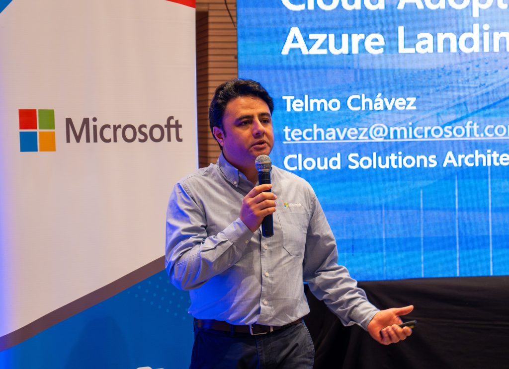 La agenda del evento inicio con Telmo Chávez, cloud Solution Architect Microsoft que dio la charla “Cloud Adoption Framework-AI Ready-Azure Landing Zone”.