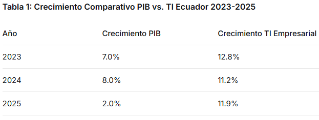 Los datos revelan una tendencia alentadora, mientras el PIB ecuatoriano proyecta un crecimiento del 2.0% para 2025, el mercado de TI empresarial crecerá un 11.9%, alcanzando los 1,587 MM USD; esta divergencia positiva evidencia la creciente importancia de la tecnología como motor de competitividad empresarial.