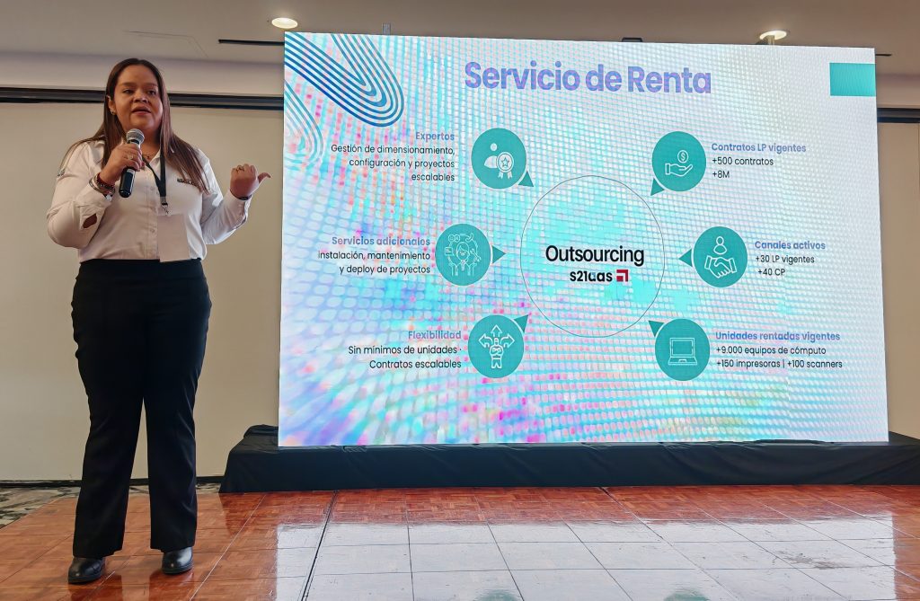 Nicolas Gallardo, también destacó la Unidad de Servicio de Renta o Outsoucing s21aas, liderada por Matilde Dillon, la cual permite la gestión de dimensionamiento, configuración y proyectos escalables; instalación, mantenimiento y despliegue de proyectos; sin mínimos de unidades; más de 500 contratos vigentes y más de 9.000 equipos de cómputo y más de 300 equipos entres impresoras y escaners rentadas al momento.